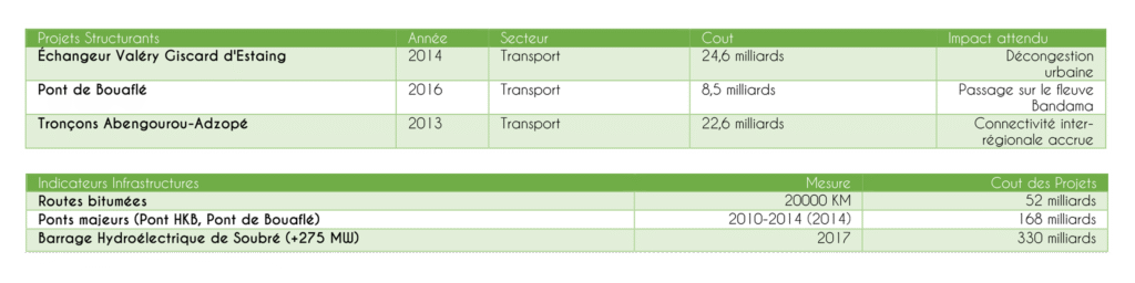 Cette dynamique de grands travaux peut être illustrée par plusieurs projets emblématiques réalisés durant cette période, avec leurs coûts et impacts attendus.